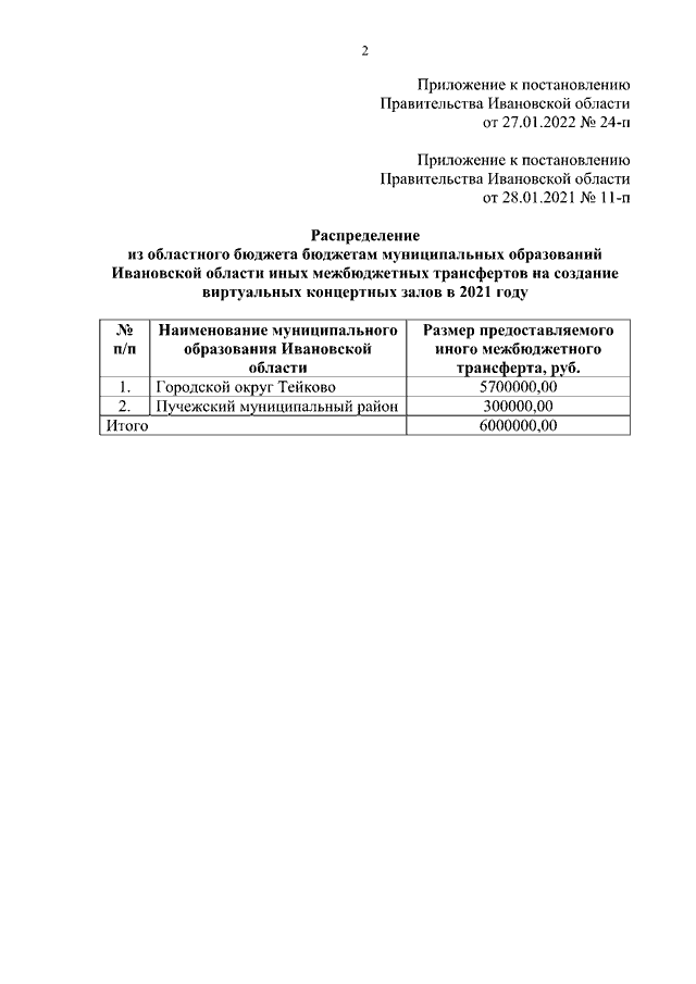 Постановление Правительства Ивановской области от 27.01.2022 N 24-п "О внесении изменений в постановление Правительства Ивановской области от 28.01.2021 N 11-п "О распределении из областного бюджета бюджетам муниципальных образований Ивановской области иных межбюджетных трансфертов на создание виртуальных концертных залов в 2021 - 2022 годах"
