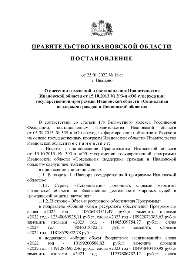 Постановление Правительства Ивановской области от 25.01.2022 N 18-п "О внесении изменений в постановление Правительства Ивановской области от 15.10.2013 N 393-п "Об утверждении государственной программы Ивановской области "Социальная поддержка граждан в Ивановской области"