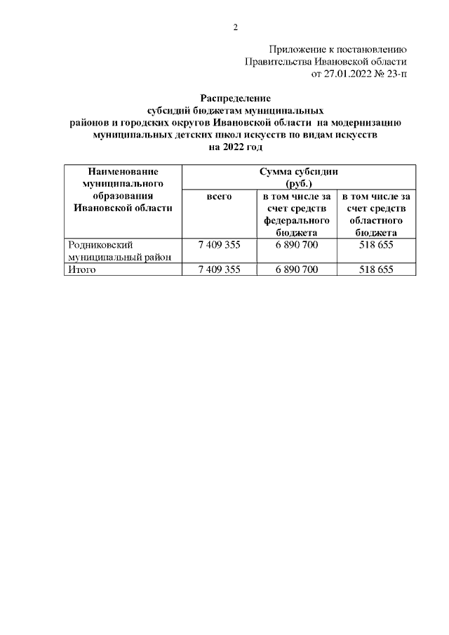 Постановление Правительства Ивановской области от 27.01.2022 N 23-п "О распределении субсидий бюджетам муниципальных районов и городских округов Ивановской области на модернизацию муниципальных детских школ искусств по видам искусств на 2022 год"