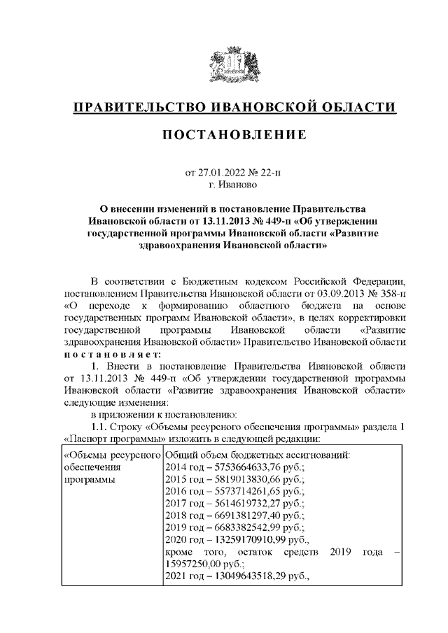 Постановление Правительства Ивановской области от 27.01.2022 N 22-п "О внесении изменений в постановление Правительства Ивановской области от 13.11.2013 N 449-п "Об утверждении государственной программы Ивановской области "Развитие здравоохранения Ивановской области"