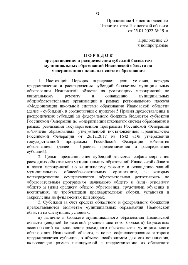 Постановление Правительства Ивановской области от 25.01.2022 N 19-п "О внесении изменений в постановление Правительства Ивановской области от 13.11.2013 N 450-п "Об утверждении государственной программы "Развитие образования Ивановской области" (вместе с "Методикой распределения и правилами предоставления иных межбюджетных трансфертов бюджетам муниципальных районов Ивановской области на благоустройство территорий муниципальных дошкольных образовательных организаций Ивановской области в 2022 году", "Порядком предоставления и распределения субсидий бюджетам муниципальных образований Ивановской области на модернизацию школьных систем образования", "Порядком предоставления из областного бюджета гранта в форме субсидий некоммерческим организациям на реализацию на территории Ивановской области практик поддержки добровольчества (волонтерства) по итогам проведения ежегодного всероссийского конкурса лучших региональных практик поддержки и развития добровольчества (волонтерства) "Регион добрых дел" в 2022 году")