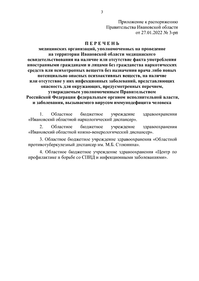 Распоряжение Правительства Ивановской области от 27.01.2022 N 3-рп "Об утверждении перечня медицинских организаций, уполномоченных на проведение на территории Ивановской области медицинского освидетельствования на наличие или отсутствие факта употребления иностранными гражданами и лицами без гражданства наркотических средств или психотропных веществ без назначения врача либо новых потенциально опасных психоактивных веществ, на наличие или отсутствие у них инфекционных заболеваний, представляющих опасность для окружающих, предусмотренных перечнем, утверждаемым уполномоченным Правительством Российской Федерации федеральным органом исполнительной власти, и заболевания, вызываемого вирусом иммунодефицита человека"