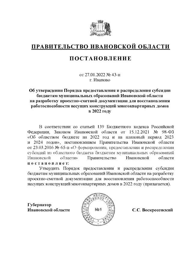 Постановление Правительства Ивановской области от 27.01.2022 N 43-п "Об утверждении Порядка предоставления и распределения субсидии бюджетам муниципальных образований Ивановской области на разработку проектно-сметной документации для восстановления работоспособности несущих конструкций многоквартирных домов в 2022 году"