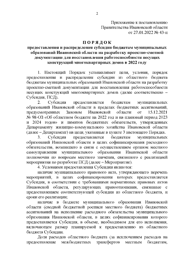 Постановление Правительства Ивановской области от 27.01.2022 N 43-п "Об утверждении Порядка предоставления и распределения субсидии бюджетам муниципальных образований Ивановской области на разработку проектно-сметной документации для восстановления работоспособности несущих конструкций многоквартирных домов в 2022 году"