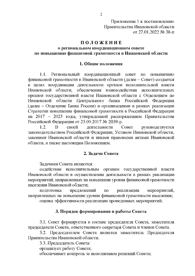 Постановление Правительства Ивановской области от 27.01.2022 N 38-п "О региональном координационном совете по повышению финансовой грамотности населения в Ивановской области" (вместе с "Положением о региональном координационном совете по повышению финансовой грамотности в Ивановской области")