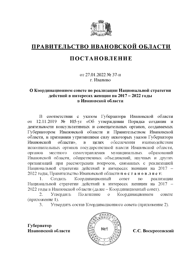 Постановление Правительства Ивановской области от 27.01.2022 N 37-п "О Координационном совете по реализации Национальной стратегии действий в интересах женщин на 2017 - 2022 годы в Ивановской области" (вместе с "Положением о Координационном совете по реализации Национальной стратегии действий в интересах женщин на 2017 - 2022 годы в Ивановской области")