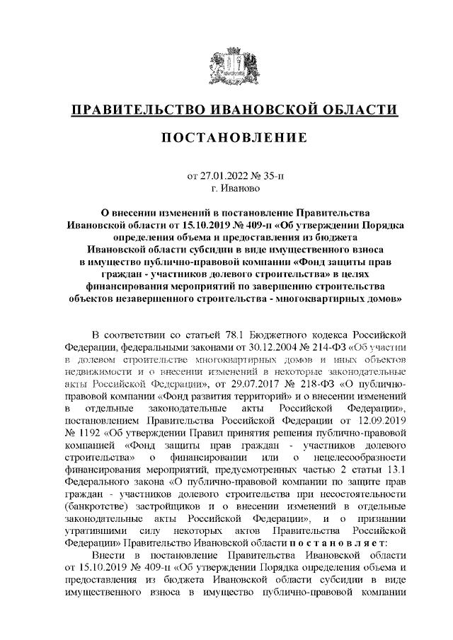 Постановление Правительства Ивановской области от 27.01.2022 N 35-п "О внесении изменений в постановление Правительства Ивановской области от 15.10.2019 N 409-п "Об утверждении Порядка определения объема и предоставления из бюджета Ивановской области субсидии в виде имущественного взноса в имущество публично-правовой компании "Фонд защиты прав граждан - участников долевого строительства" в целях финансирования мероприятий по завершению строительства объектов незавершенного строительства - многоквартирных домов"