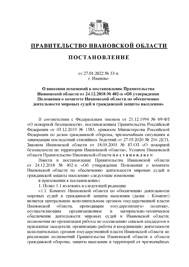 Постановление Правительства Ивановской области от 27.01.2022 N 33-п "О внесении изменений в постановление Правительства Ивановской области от 24.12.2018 N 402-п "Об утверждении Положения о комитете Ивановской области по обеспечению деятельности мировых судей и гражданской защиты населения"