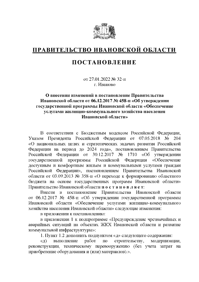 Постановление Правительства Ивановской области от 27.01.2022 N 32-п "О внесении изменений в постановление Правительства Ивановской области от 06.12.2017 N 458-п "Об утверждении государственной программы Ивановской области "Обеспечение услугами жилищно-коммунального хозяйства населения Ивановской области"