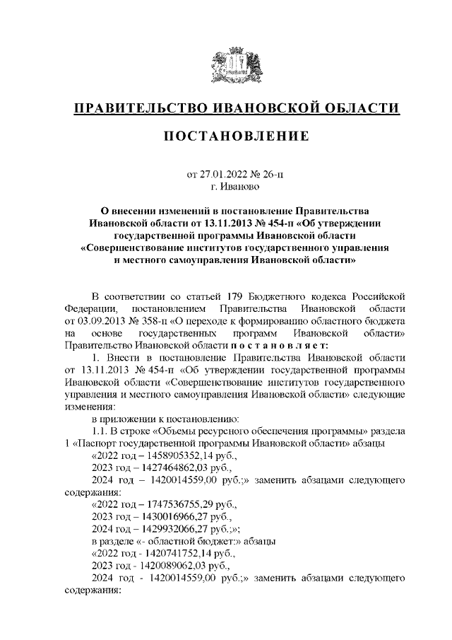 Постановление Правительства Ивановской области от 27.01.2022 N 26-п "О внесении изменений в постановление Правительства Ивановской области от 13.11.2013 N 454-п "Об утверждении государственной программы Ивановской области "Совершенствование институтов государственного управления и местного самоуправления Ивановской области"