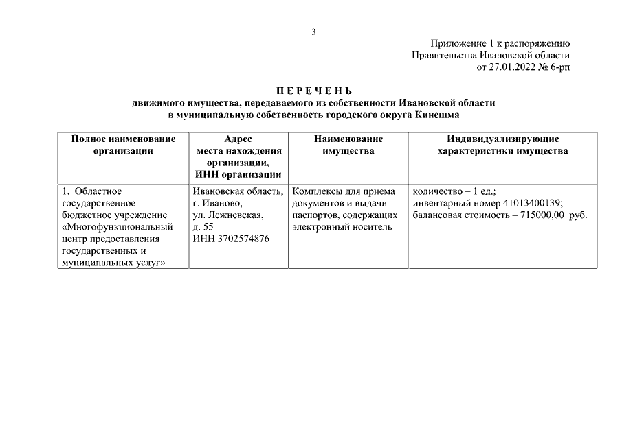 Распоряжение Правительства Ивановской области от 27.01.2022 N 6-рп "О передаче движимого имущества из собственности Ивановской области в собственность муниципальных образований Ивановской области"