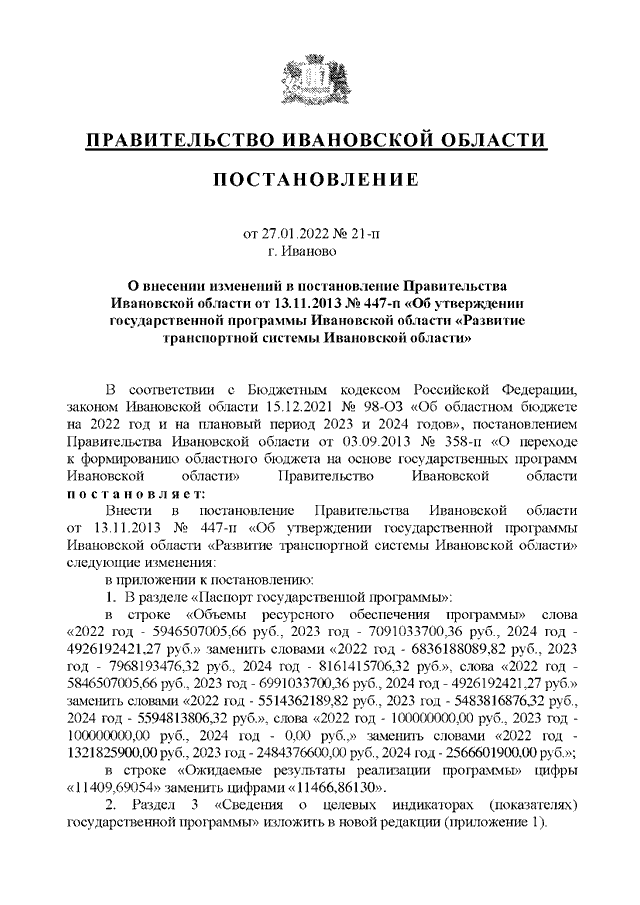 Постановление Правительства Ивановской области от 27.01.2022 N 21-п "О внесении изменений в постановление Правительства Ивановской области от 13.11.2013 N 447-п "Об утверждении государственной программы Ивановской области "Развитие транспортной системы Ивановской области" (вместе с "Методикой распределения и правилами предоставления иных межбюджетных трансфертов бюджетам муниципальных образований Ивановской области на строительство и реконструкцию автомобильных дорог общего пользования местного значения")