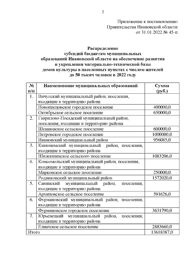 Постановление Правительства Ивановской области от 31.01.2022 N 45-п "О распределении субсидий бюджетам муниципальных образований Ивановской области на обеспечение развития и укрепления материально-технической базы домов культуры в населенных пунктах с числом жителей до 50 тысяч человек в 2022 году"