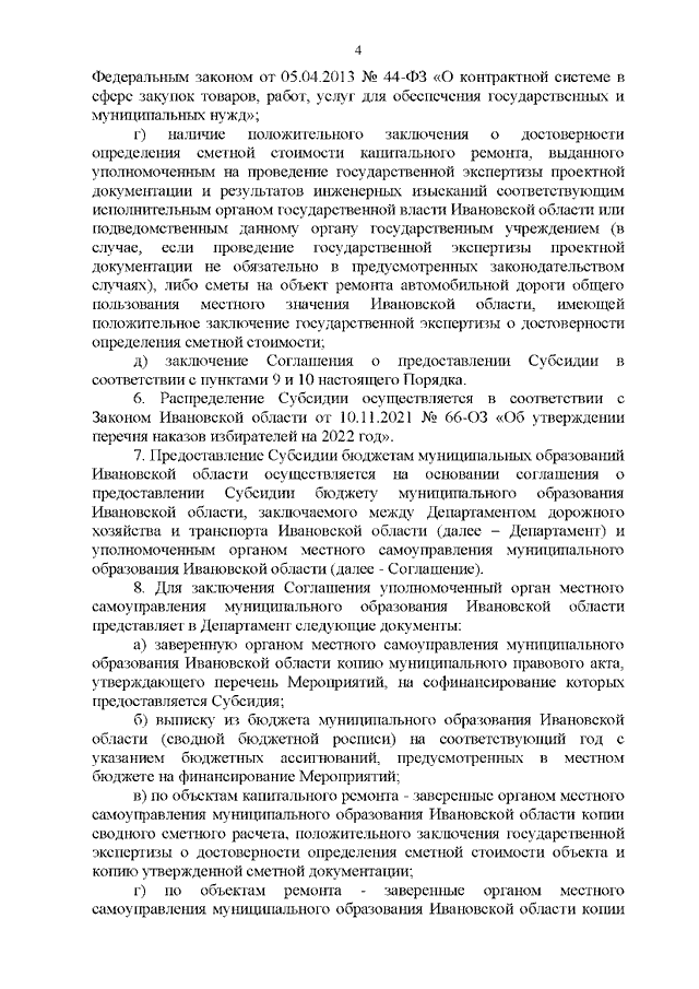 Постановление Правительства Ивановской области от 31.01.2022 N 53-п "Об утверждении Порядка предоставления субсидии из областного бюджета бюджетам муниципальных образований Ивановской области на ремонт и капитальный ремонт автомобильных дорог в рамках иных непрограммных мероприятий по наказам избирателей депутатам Ивановской областной Думы на 2022 год"