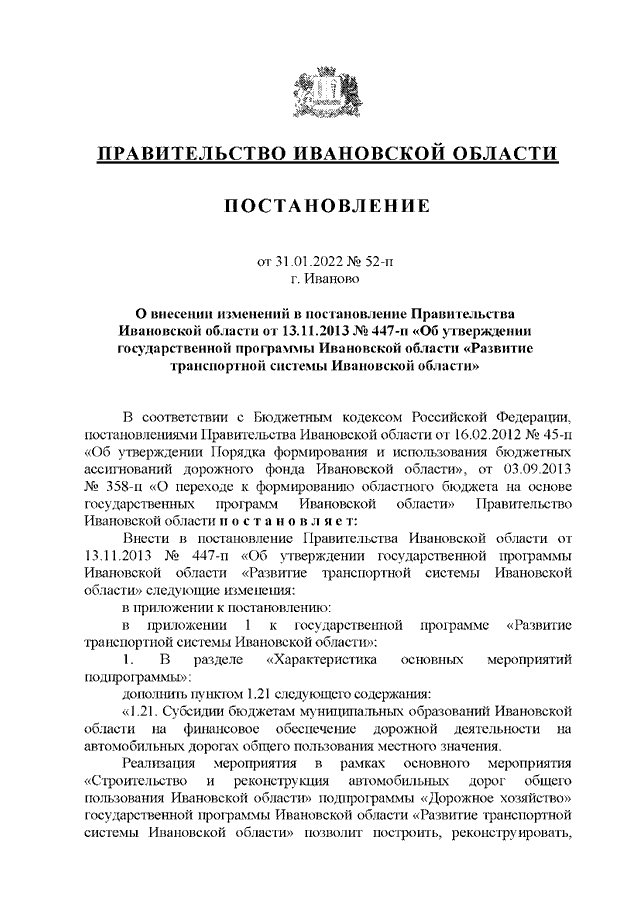 Постановление Правительства Ивановской области от 31.01.2022 N 52-п "О внесении изменений в постановление Правительства Ивановской области от 13.11.2013 N 447-п "Об утверждении государственной программы Ивановской области "Развитие транспортной системы Ивановской области" (вместе с "Порядком предоставления и распределения субсидий бюджетам муниципальных образований Ивановской области на финансовое обеспечение дорожной деятельности на автомобильных дорогах общего пользования местного значения")