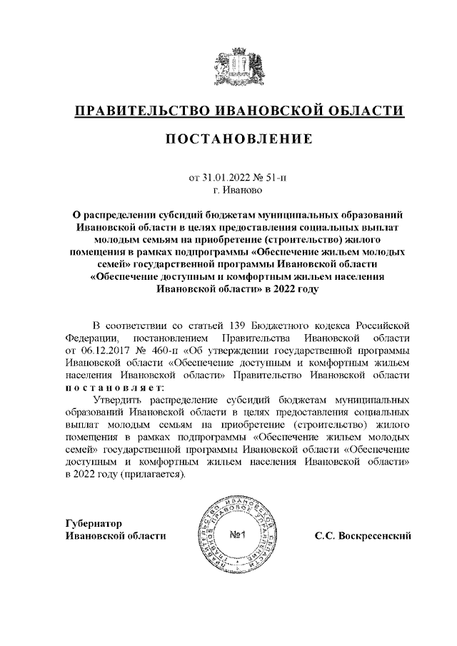 Постановление Правительства Ивановской области от 31.01.2022 N 51-п "О распределении субсидий бюджетам муниципальных образований Ивановской области в целях предоставления социальных выплат молодым семьям на приобретение (строительство) жилого помещения в рамках подпрограммы "Обеспечение жильем молодых семей" государственной программы Ивановской области "Обеспечение доступным и комфортным жильем населения Ивановской области" в 2022 году"