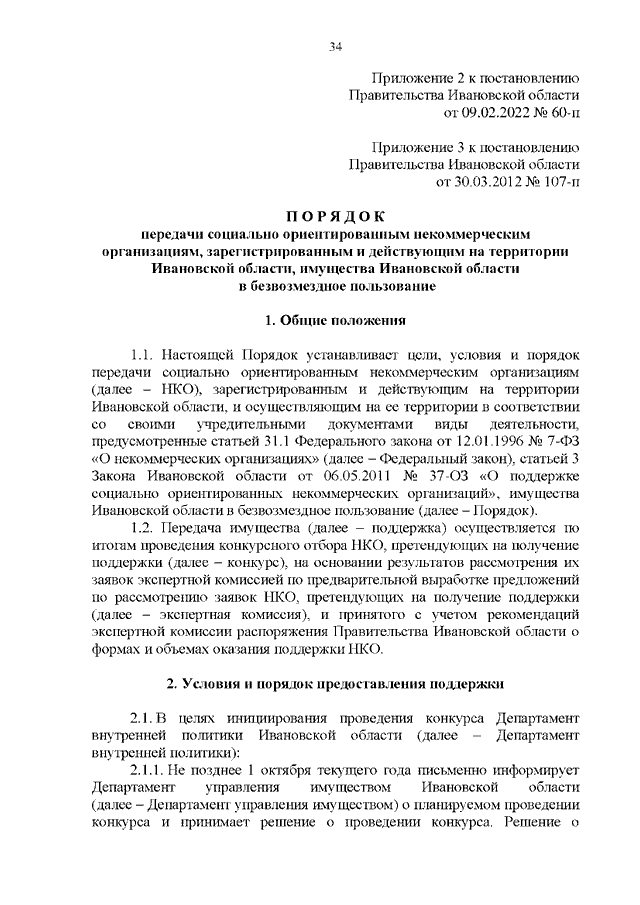 Постановление Правительства Ивановской области от 09.02.2022 N 60-п "О внесении изменений в постановление Правительства Ивановской области от 30.03.2012 N 107-п "О порядке, объемах и условиях предоставления поддержки социально ориентированным некоммерческим организациям, зарегистрированным и действующим на территории Ивановской области" (вместе с "Порядком предоставления социально ориентированным некоммерческим организациям, зарегистрированным и действующим на территории Ивановской области, являющимся исполнителями общественно полезных услуг, грантов в форме субсидий на оказание общественно полезной услуги", "Порядком передачи социально ориентированным некоммерческим организациям, зарегистрированным и действующим на территории Ивановской области, имущества Ивановской области в безвозмездное пользование")