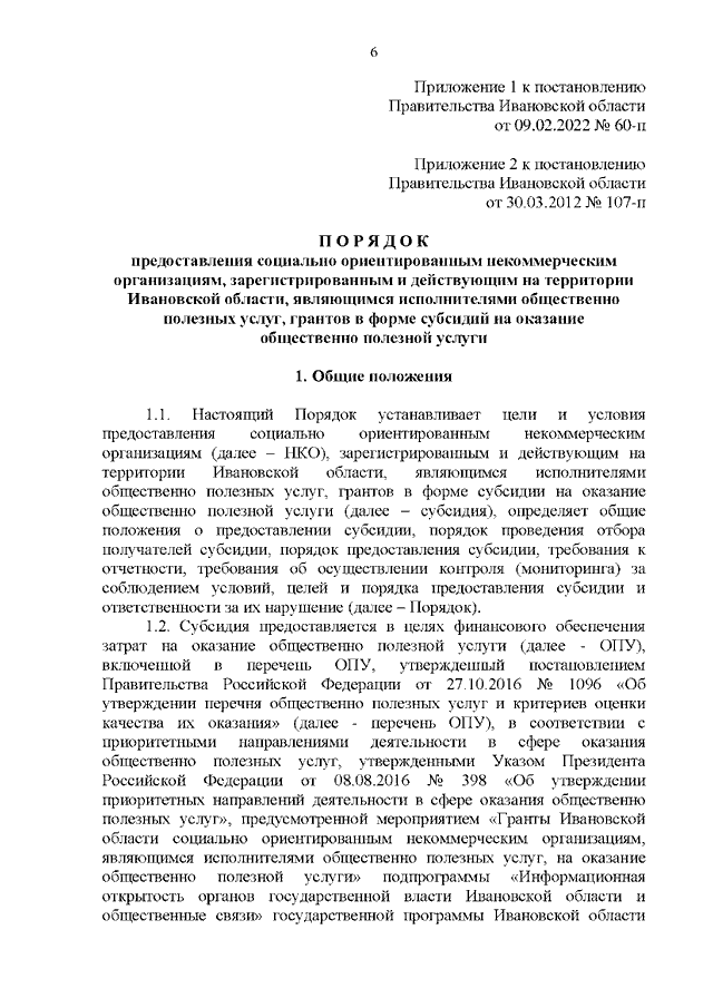 Постановление Правительства Ивановской области от 09.02.2022 N 60-п "О внесении изменений в постановление Правительства Ивановской области от 30.03.2012 N 107-п "О порядке, объемах и условиях предоставления поддержки социально ориентированным некоммерческим организациям, зарегистрированным и действующим на территории Ивановской области" (вместе с "Порядком предоставления социально ориентированным некоммерческим организациям, зарегистрированным и действующим на территории Ивановской области, являющимся исполнителями общественно полезных услуг, грантов в форме субсидий на оказание общественно полезной услуги", "Порядком передачи социально ориентированным некоммерческим организациям, зарегистрированным и действующим на территории Ивановской области, имущества Ивановской области в безвозмездное пользование")
