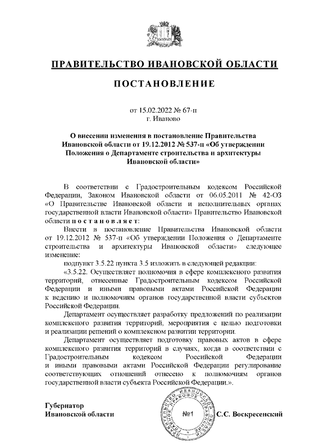 Постановление Правительства Ивановской области от 15.02.2022 N 67-п "О внесении изменения в постановление Правительства Ивановской области от 19.12.2012 N 537-п "Об утверждении Положения о Департаменте строительства и архитектуры Ивановской области"