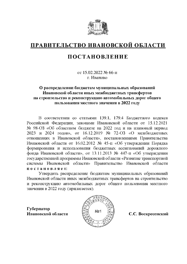 Постановление Правительства Ивановской области от 15.02.2022 N 66-п "О распределении бюджетам муниципальных образований Ивановской области иных межбюджетных трансфертов на строительство и реконструкцию автомобильных дорог общего пользования местного значения в 2022 году"
