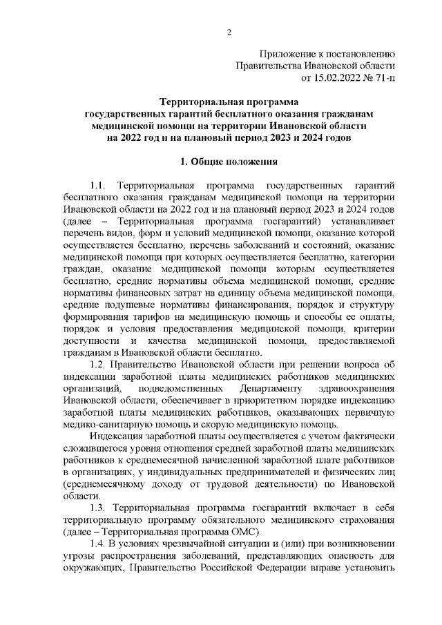 Постановление Правительства Ивановской области от 15.02.2022 N 71-п "Об утверждении Территориальной программы государственных гарантий бесплатного оказания гражданам медицинской помощи на территории Ивановской области на 2022 год и на плановый период 2023 и 2024 годов"