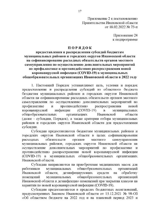 Постановление Правительства Ивановской области от 18.02.2022 N 73-п "О внесении изменений в постановление Правительства Ивановской области от 13.11.2013 N 450-п "Об утверждении государственной программы "Развитие образования Ивановской области" (вместе с "Порядком предоставления и распределения субсидий бюджетам муниципальных образований Ивановской области на модернизацию школьных систем образования", "Порядком предоставления и распределения субсидий бюджетам муниципальных районов и городских округов Ивановской области на софинансирование расходных обязательств органов местного самоуправления по осуществлению дополнительных мероприятий по профилактике и противодействию распространения новой коронавирусной инфекции (COVID-19) в муниципальных общеобразовательных организациях Ивановской области в 2022 году")