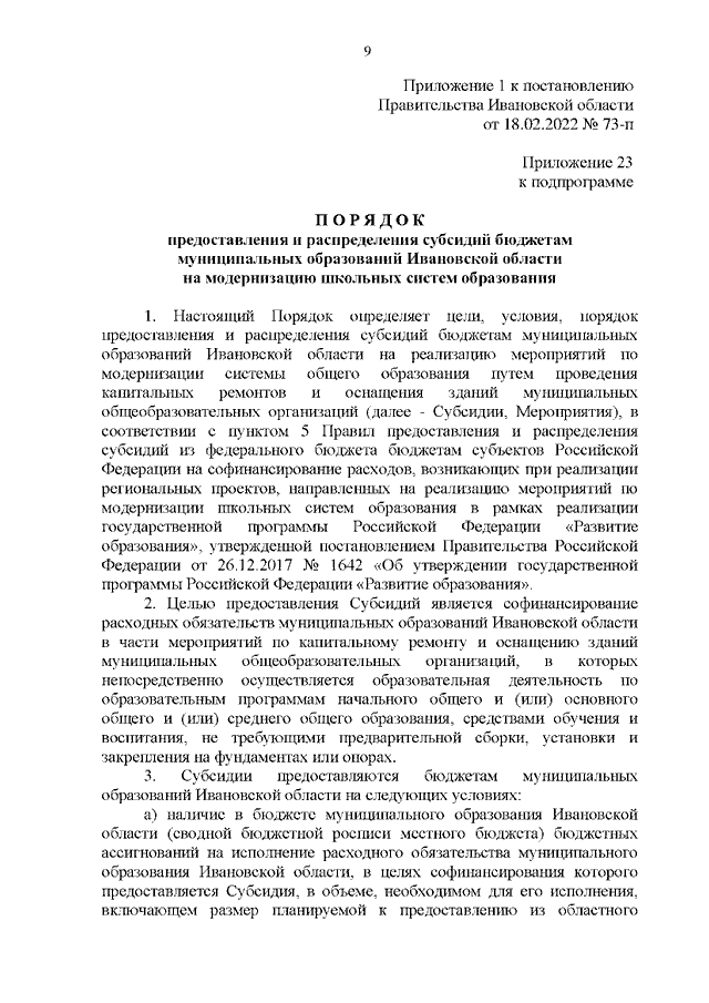 Постановление Правительства Ивановской области от 18.02.2022 N 73-п "О внесении изменений в постановление Правительства Ивановской области от 13.11.2013 N 450-п "Об утверждении государственной программы "Развитие образования Ивановской области" (вместе с "Порядком предоставления и распределения субсидий бюджетам муниципальных образований Ивановской области на модернизацию школьных систем образования", "Порядком предоставления и распределения субсидий бюджетам муниципальных районов и городских округов Ивановской области на софинансирование расходных обязательств органов местного самоуправления по осуществлению дополнительных мероприятий по профилактике и противодействию распространения новой коронавирусной инфекции (COVID-19) в муниципальных общеобразовательных организациях Ивановской области в 2022 году")