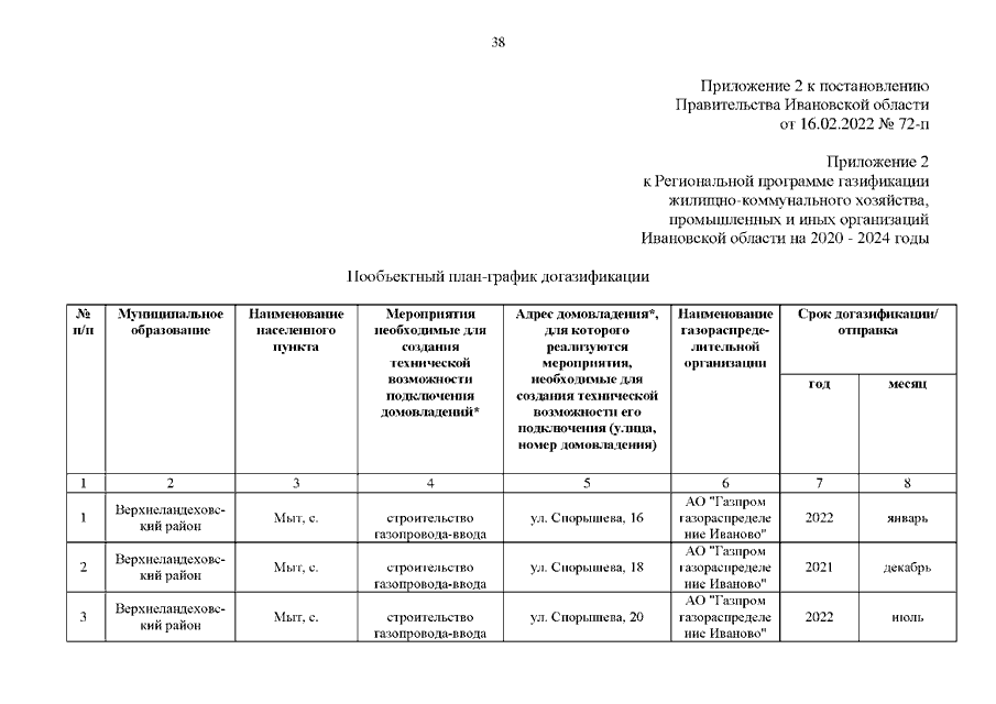 Постановление Правительства Ивановской области от 16.02.2022 N 72-п "О внесении изменений в постановление Правительства Ивановской области от 28.12.2020 N 678-п "Об утверждении Региональной программы газификации жилищно-коммунального хозяйства, промышленных и иных организаций Ивановской области на 2020 - 2024 годы" (вместе со "Сводным планом-графиком догазификации", "Пообъектным планом-графиком догазификации")