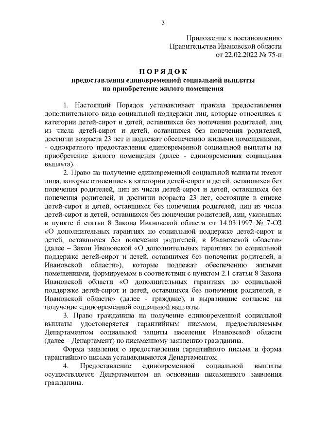 Постановление Правительства Ивановской области от 22.02.2022 N 75-п "Об утверждении Порядка предоставления единовременной социальной выплаты на приобретение жилого помещения и внесении изменения в постановление Правительства Ивановской области от 27.06.2008 N 170-п "Об утверждении Перечня государственных услуг (работ), предоставляемых (выполняемых) исполнительными органами государственной власти Ивановской области и подведомственными им учреждениями"