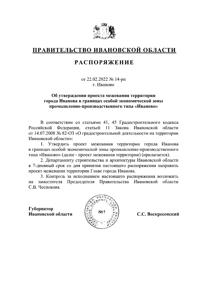 Распоряжение Правительства Ивановской области от 22.02.2022 N 14-рп "Об утверждении проекта межевания территории города Иванова в границах особой экономической зоны промышленно-производственного типа "Иваново"