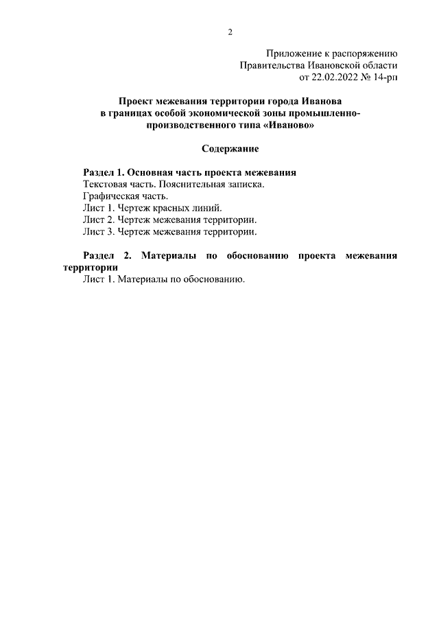 Распоряжение Правительства Ивановской области от 22.02.2022 N 14-рп "Об утверждении проекта межевания территории города Иванова в границах особой экономической зоны промышленно-производственного типа "Иваново"