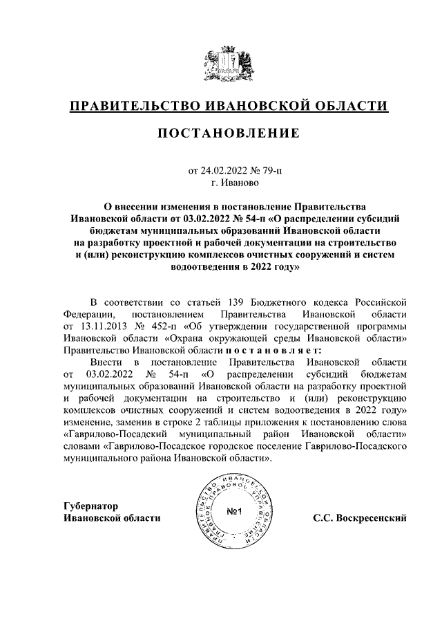 Постановление Правительства Ивановской области от 24.02.2022 N 79-п "О внесении изменения в постановление Правительства Ивановской области от 03.02.2022 N 54-п "О распределении субсидий бюджетам муниципальных образований Ивановской области на разработку проектной и рабочей документации на строительство и (или) реконструкцию комплексов очистных сооружений и систем водоотведения в 2022 году"