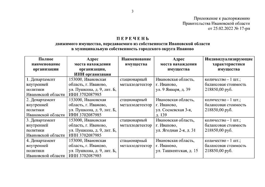 Распоряжение Правительства Ивановской области от 25.02.2022 N 17-рп "О передаче из собственности Ивановской области в муниципальную собственность городского округа Иваново стационарных металлодетекторов"