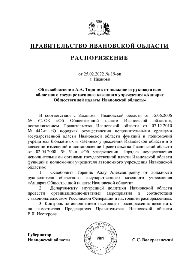 Распоряжение Правительства Ивановской области от 25.02.2022 N 19-рп "Об освобождении А.А. Торяник от должности руководителя областного государственного казенного учреждения "Аппарат Общественной палаты Ивановской области"
