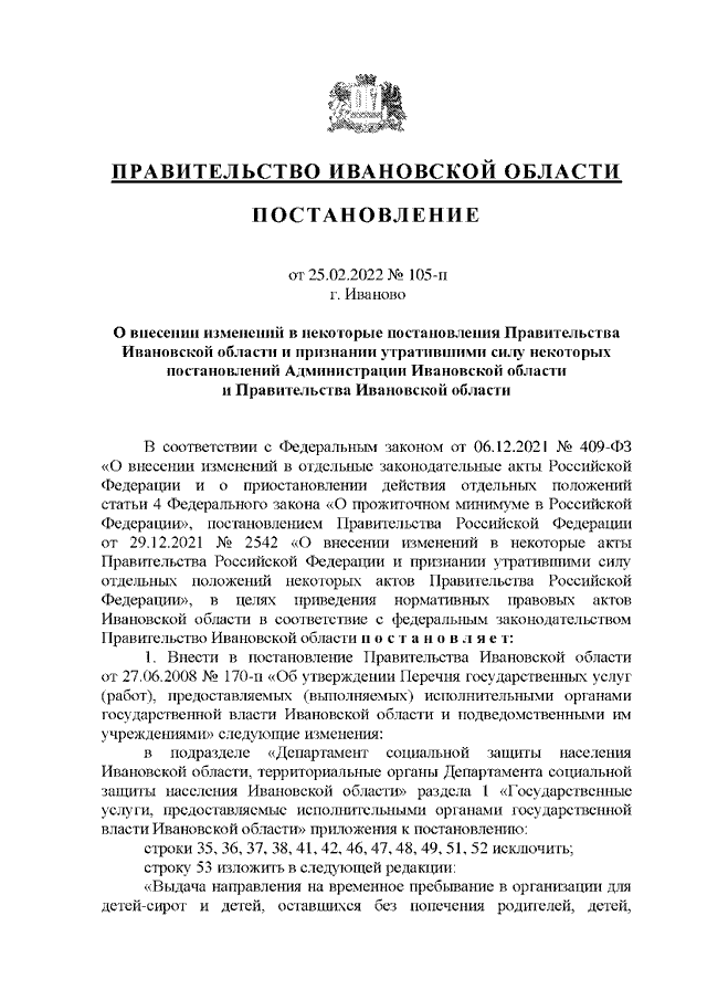 Постановление Правительства Ивановской области от 25.02.2022 N 105-п "О внесении изменений в некоторые постановления Правительства Ивановской области и признании утратившими силу некоторых постановлений Администрации Ивановской области и Правительства Ивановской области"