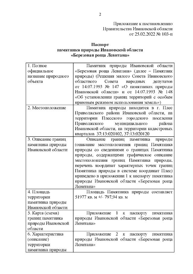 Постановление Правительства Ивановской области от 25.02.2022 N 103-п "О памятнике природы Ивановской области "Березовая роща Левитана" (вместе с "Паспортом памятника природы Ивановской области "Березовая роща Левитана")