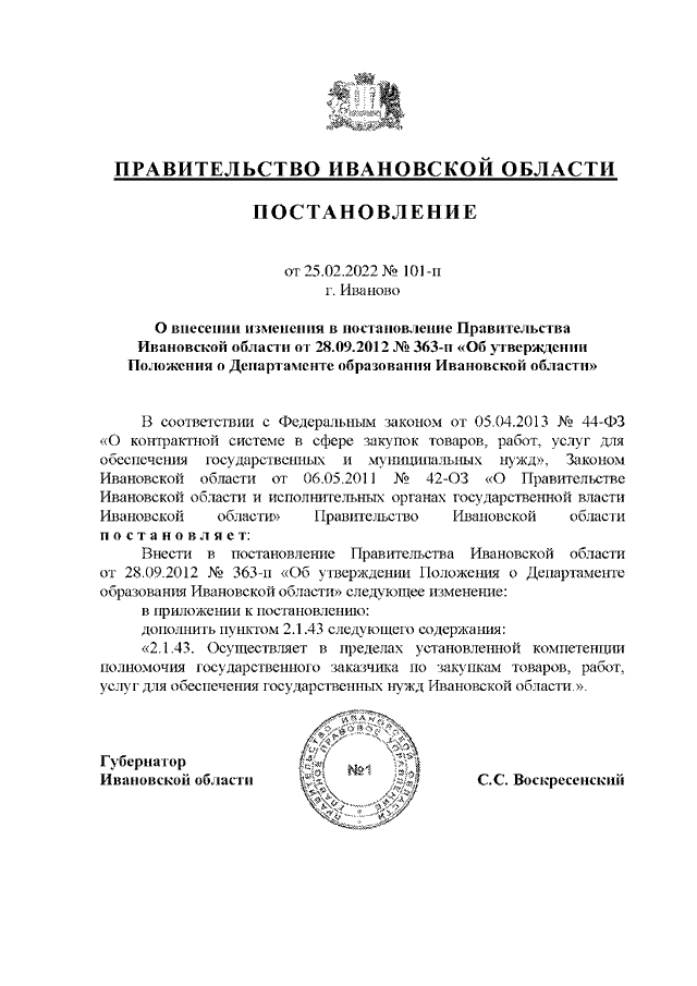 Постановление Правительства Ивановской области от 25.02.2022 N 101-п "О внесении изменения в постановление Правительства Ивановской области от 28.09.2012 N 363-п "Об утверждении Положения о Департаменте образования Ивановской области"