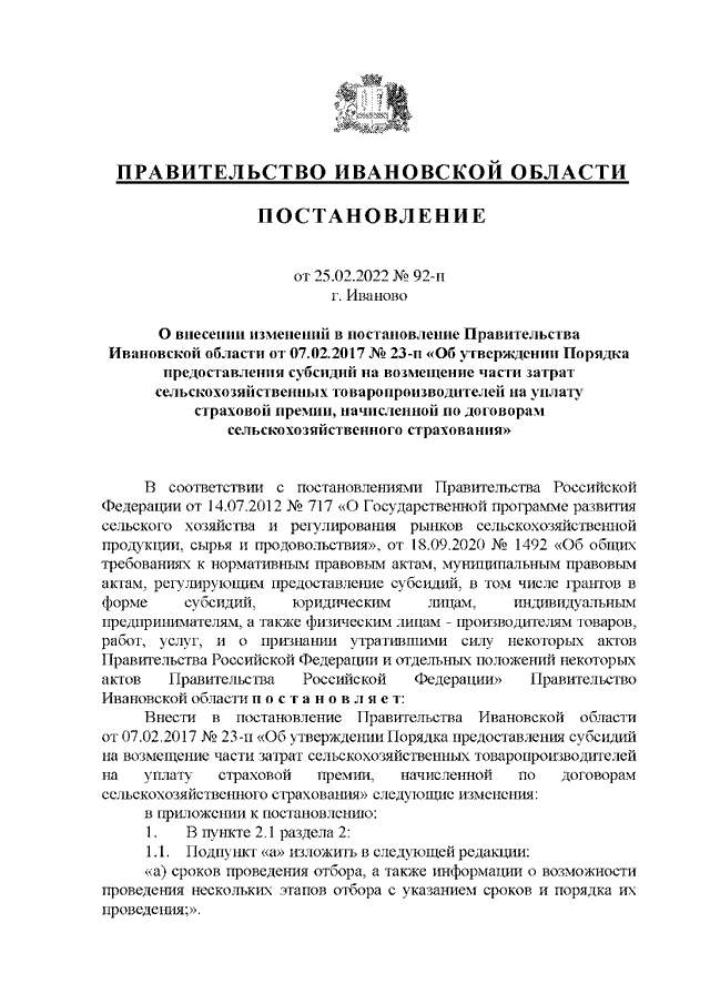 Постановление Правительства Ивановской области от 25.02.2022 N 92-п "О внесении изменений в постановление Правительства Ивановской области от 07.02.2017 N 23-п "Об утверждении Порядка предоставления субсидий на возмещение части затрат сельскохозяйственных товаропроизводителей на уплату страховой премии, начисленной по договорам сельскохозяйственного страхования"