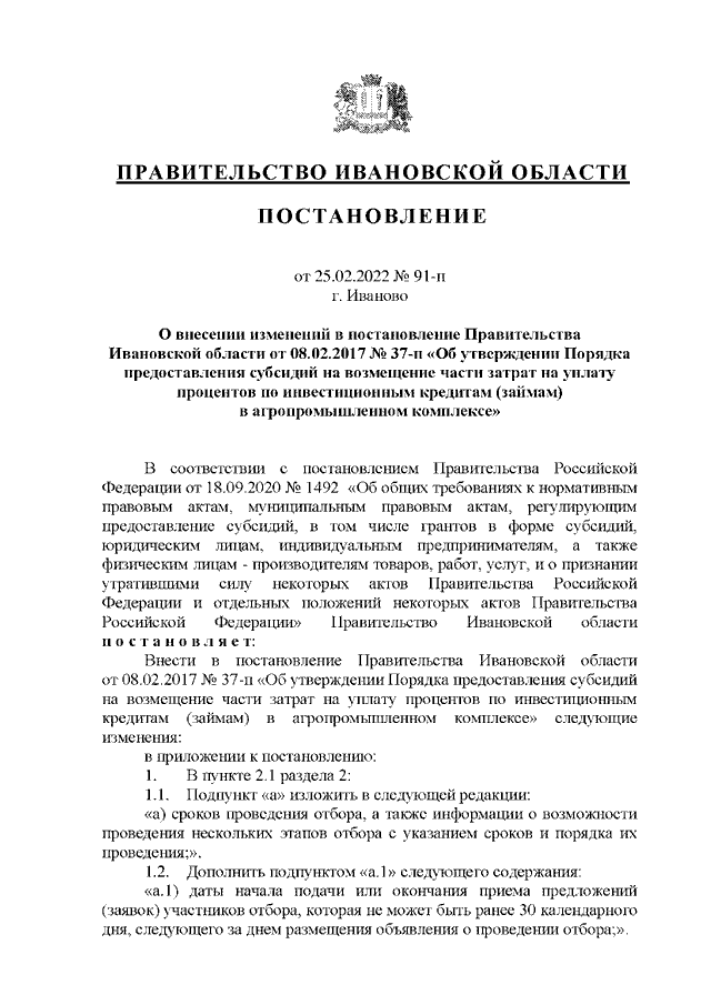 Постановление Правительства Ивановской области от 25.02.2022 N 91-п "О внесении изменений в постановление Правительства Ивановской области от 08.02.2017 N 37-п "Об утверждении Порядка предоставления субсидий на возмещение части затрат на уплату процентов по инвестиционным кредитам (займам) в агропромышленном комплексе"