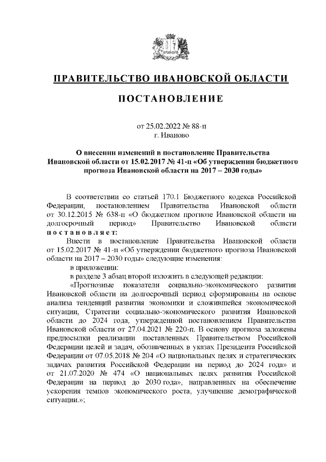 Постановление Правительства Ивановской области от 25.02.2022 N 88-п "О внесении изменений в постановление Правительства Ивановской области от 15.02.2017 N 41-п "Об утверждении бюджетного прогноза Ивановской области на 2017 - 2030 годы"