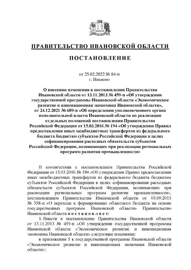 Постановление Правительства Ивановской области от 25.02.2022 N 84-п "О внесении изменения в постановления Правительства Ивановской области от 13.11.2013 N 459-п "Об утверждении государственной программы Ивановской области "Экономическое развитие и инновационная экономика Ивановской области", от 24.12.2021 N 689-п "Об определении уполномоченного органа исполнительной власти Ивановской области по реализации отдельных положений постановления Правительства Российской Федерации от 15.03.2016 N 194 "Об утверждении Правил предоставления иных межбюджетных трансфертов из федерального бюджета бюджетам субъектов Российской Федерации в целях софинансирования расходных обязательств субъектов Российской Федерации, возникающих при реализации региональных программ развития промышленности"