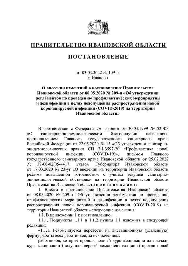 Постановление Правительства Ивановской области от 03.03.2022 N 109-п "О внесении изменений в постановление Правительства Ивановской области от 08.05.2020 N 209-п "Об утверждении регламентов по проведению профилактических мероприятий и дезинфекции в целях недопущения распространения новой коронавирусной инфекции (COVID-2019) на территории Ивановской области"