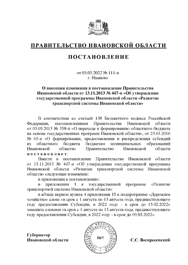 Постановление Правительства Ивановской области от 03.03.2022 N 111-п "О внесении изменения в постановление Правительства Ивановской области от 13.11.2013 N 447-п "Об утверждении государственной программы Ивановской области "Развитие транспортной системы Ивановской области"
