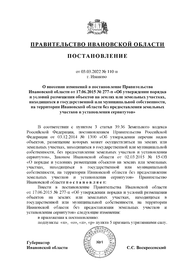 Постановление Правительства Ивановской области от 03.03.2022 N 110-п "О внесении изменений в постановление Правительства Ивановской области от 17.06.2015 N 277-п "Об утверждении порядка и условий размещения объектов на землях или земельных участках, находящихся в государственной или муниципальной собственности, на территории Ивановской области без предоставления земельных участков и установления сервитутов"
