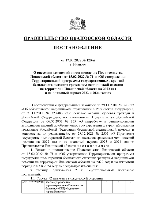 Постановление Правительства Ивановской области от 17.03.2022 N 120-п "О внесении изменений в постановление Правительства Ивановской области от 15.02.2022 N 71-п "Об утверждении Территориальной программы государственных гарантий бесплатного оказания гражданам медицинской помощи на территории Ивановской области на 2022 год и на плановый период 2023 и 2024 годов"