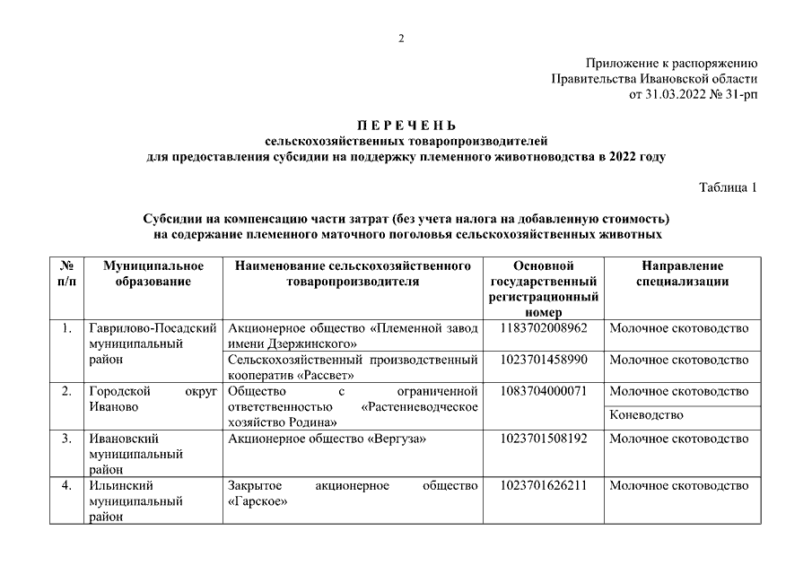 Распоряжение Правительства Ивановской области от 31.03.2022 N 31-рп "Об утверждении перечня сельскохозяйственных товаропроизводителей для предоставления субсидии на поддержку племенного животноводства в 2022 году"