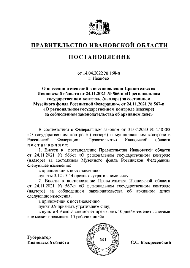 Постановление Правительства Ивановской области от 14.04.2022 N 168-п "О внесении изменений в постановления Правительства Ивановской области от 24.11.2021 N 566-п "О региональном государственном контроле (надзоре) за состоянием Музейного фонда Российской Федерации", от 24.11.2021 N 567-п "О региональном государственном контроле (надзоре) за соблюдением законодательства об архивном деле"