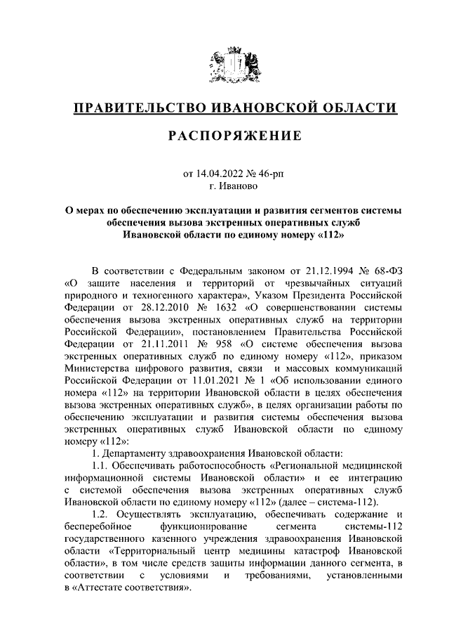 Распоряжение Правительства Ивановской области от 14.04.2022 N 46-рп "О мерах по обеспечению эксплуатации и развития сегментов системы обеспечения вызова экстренных оперативных служб Ивановской области по единому номеру "112"
