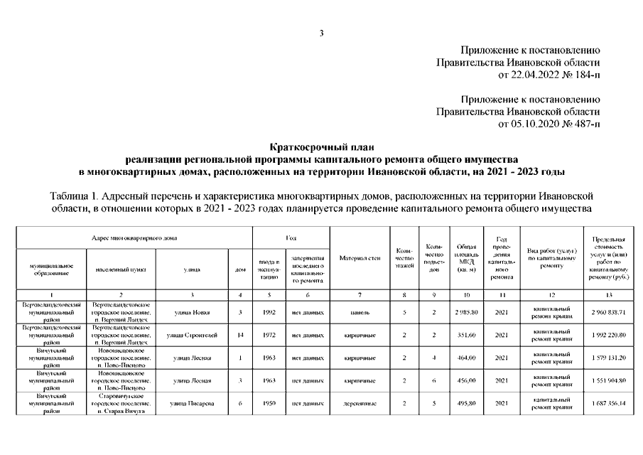 Постановление Правительства Ивановской области от 22.04.2022 N 184-п "О внесении изменения в постановление Правительства Ивановской области от 05.10.2020 N 487-п "Об утверждении краткосрочного плана реализации региональной программы капитального ремонта общего имущества в многоквартирных домах, расположенных на территории Ивановской области, на 2021 - 2023 годы"