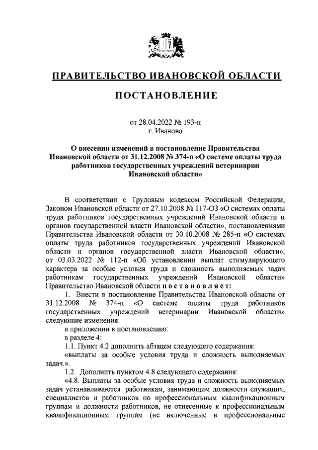 Постановление Правительства Ивановской области от 28.04.2022 N 193-п "О внесении изменений в постановление Правительства Ивановской области от 31.12.2008 N 374-п "О системе оплаты труда работников государственных учреждений ветеринарии Ивановской области"